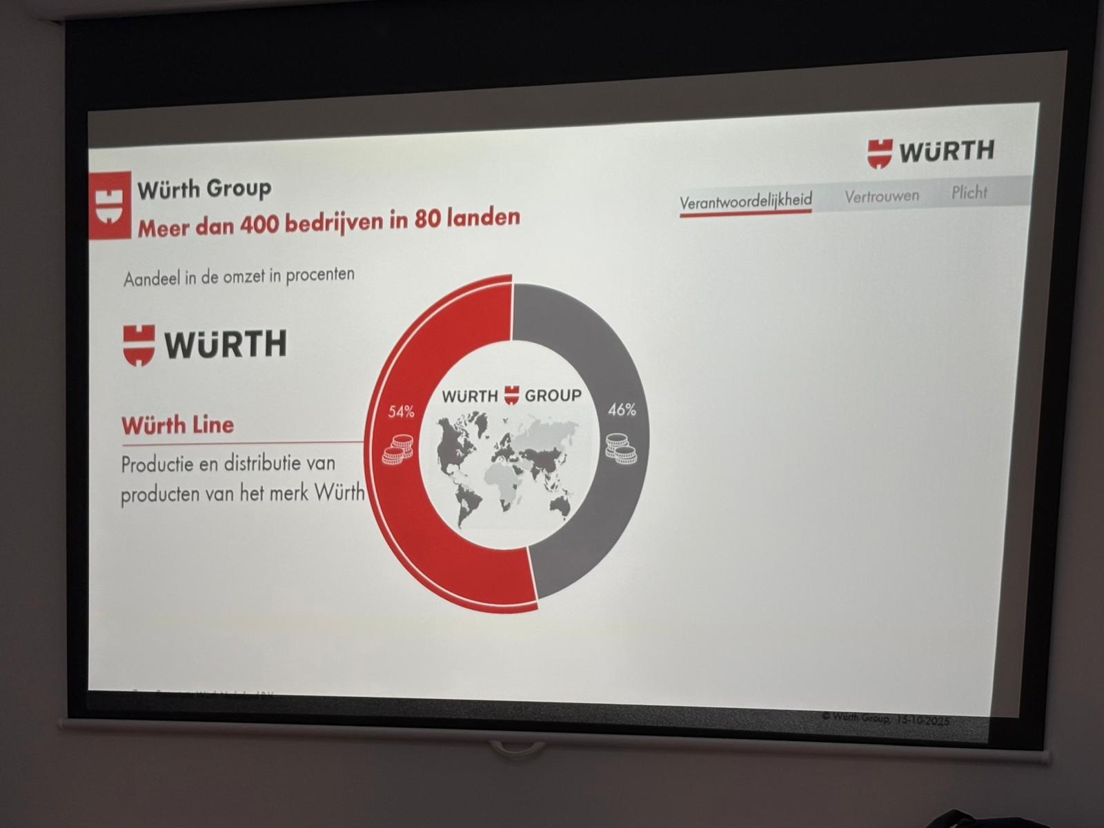 Onze gastheer, Boudy Gaastra, vertelde uitgebreid over de rijke geschiedenis van Würth. Van de start in 1945 in Duitsland door Adolf Würth, tot de wereldwijde onderneming die het nu is. Ook kregen we een goed beeld van de activiteiten in Drachten, waar service, kwaliteit en klantgerichtheid centraal staan.